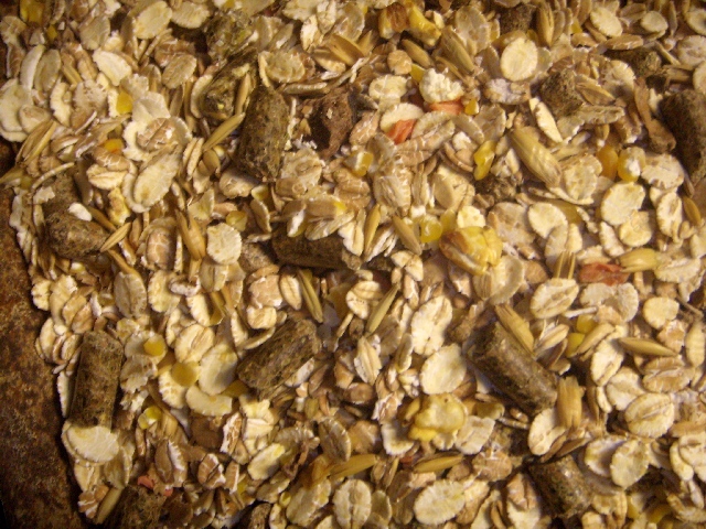 Gerste gequetscht, Hafer gequetscht, Weizenflocken, Gerstenflocken, Maisflocken, Weizenkleie grob, Grünmehl, Weizen, Johannisbrot geschnitten, Maiskraftfutter, Trockenschnitzel, Karottenwürfel, Mais gepoppt, Kürbiskernkuchen, Rapsextraktionsschrotfutter mit Stock, Melasse, Calciumcarbonat, Lignocellulose, Sonnenblumenöl, Natriumchlorid, Monocalciumphosphat, Rapskuchen, Magnesiumoxid, Leinextraktionsschrotfutter mit Soapstock, Zuckerrübenmelasse, Weizenfuttermehl, Natriumbicarbonat, Zuckerrübentrockenschnitzel