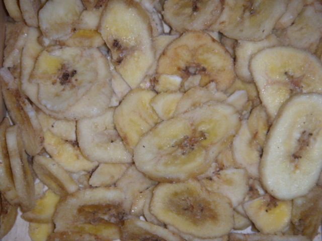 Getrocknete Bananenscheiben mit Zucker und Pflanzenöl.